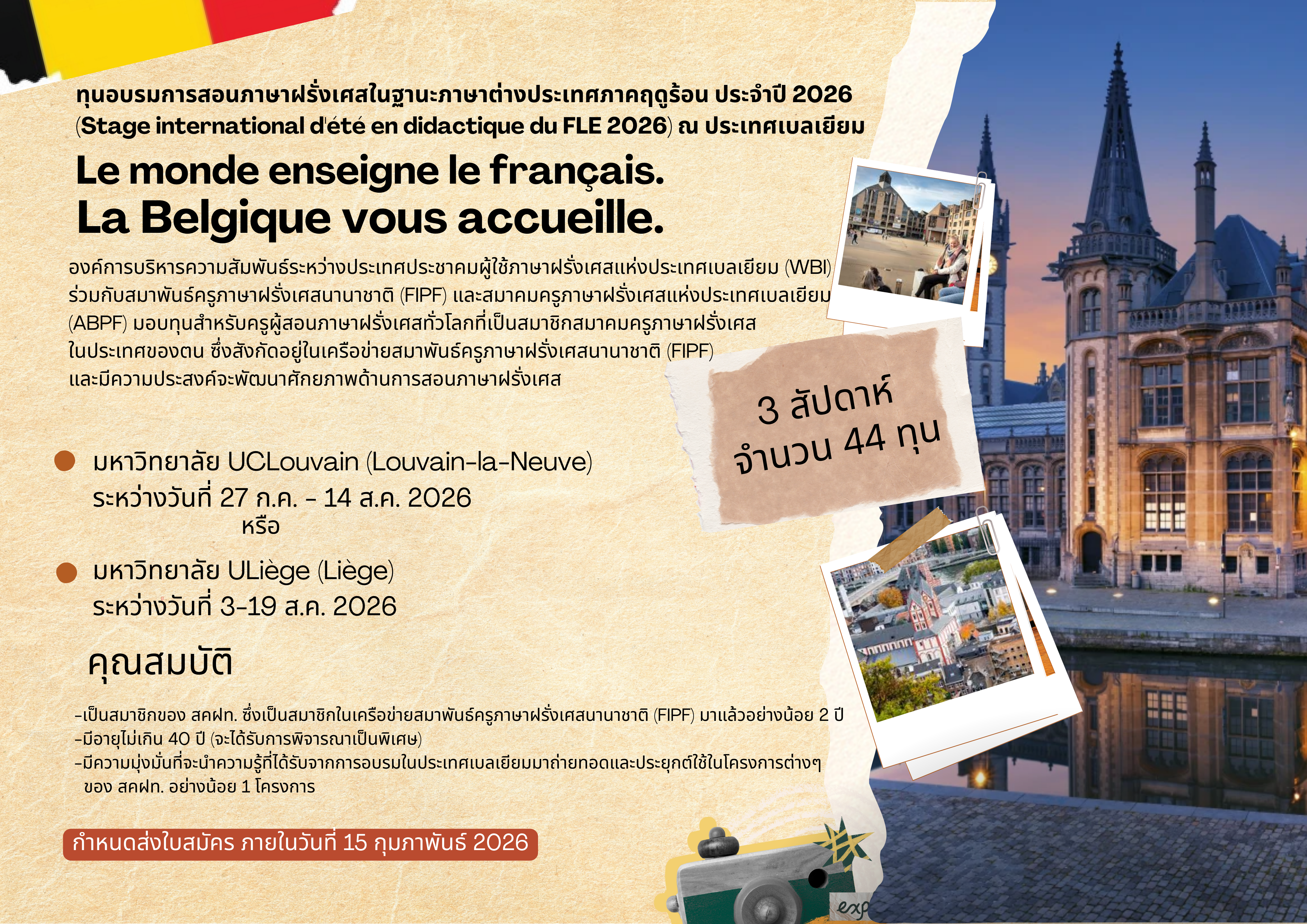 ทุนอบรมการสอนภาษาฝรั่งเศสในฐานะภาษาต่างประเทศภาคฤดูร้อน ประจำปี 2026 ณ ประเทศเบลเยียม อ่านต่อ