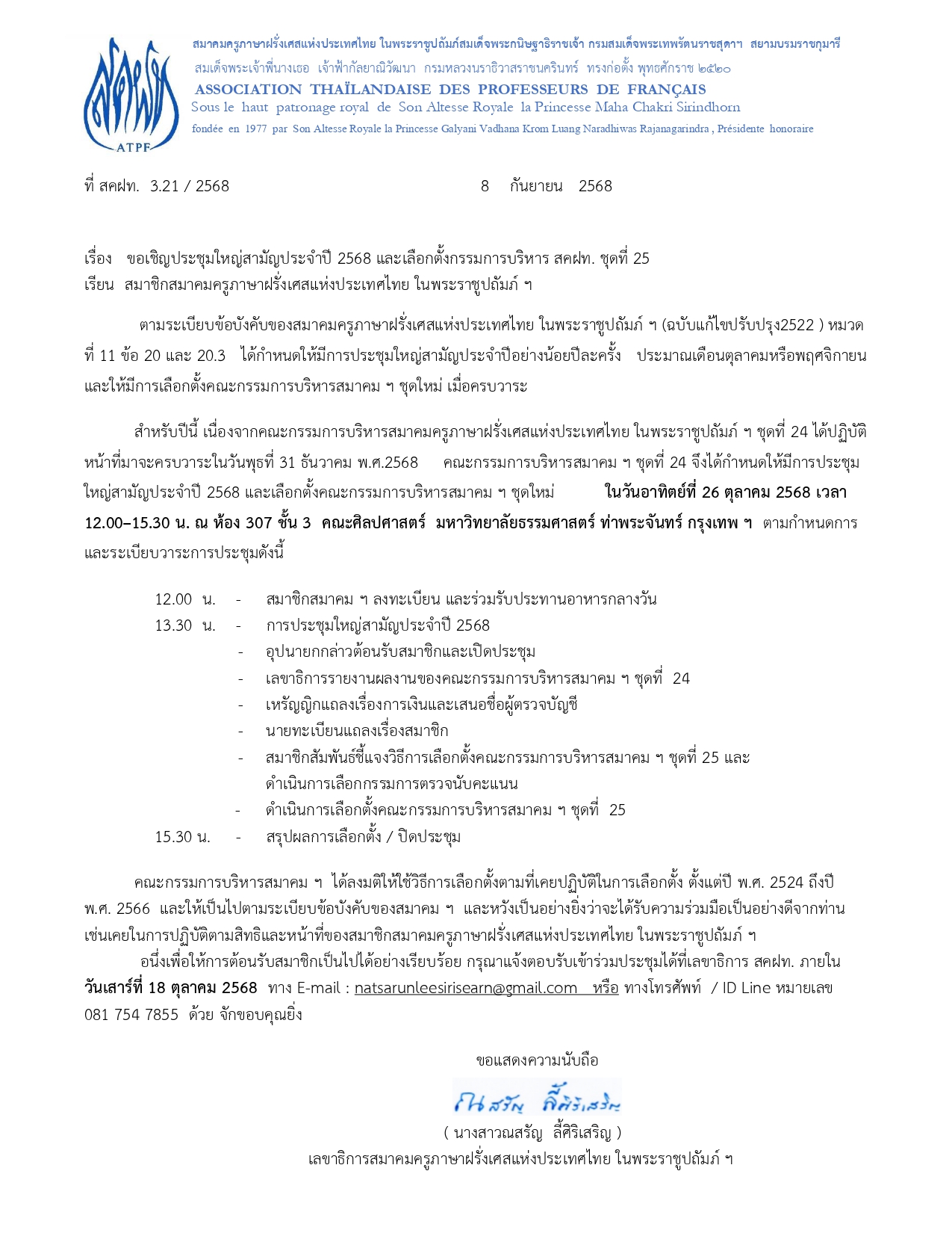 การประชุมใหญ่สามัญประจำปี 2568 และเลือกตั้งคณะกรรมการบริหารสมาคม ฯ ชุดที่ 25 ในวันอาทิตย์ที่ 26 ตุลาคม 2568 เวลา12.00–15.30 น. ณ ห้อง 307 ชั้น 3 คณะศิลปศาสตร์ มหาวิทยาลัยธรรมศาสตร์ ท่าพระจันทร์ กรุงเทพ ฯ