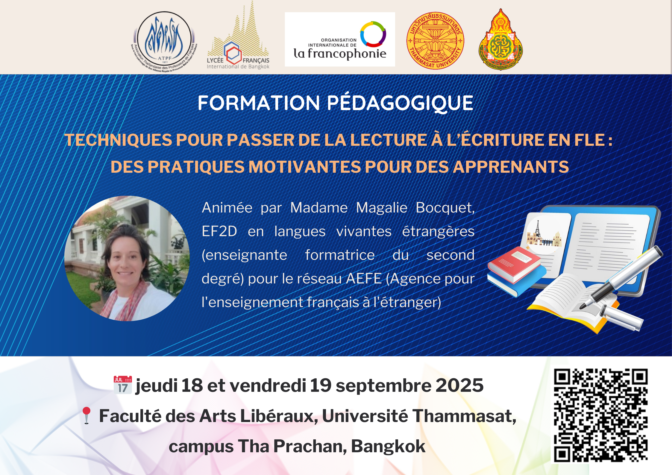 การอบรมเชิงปฏิบัติการ เรื่อง Techniques pour passer de la lecture à l’écriture en FLE : des pratiques motivantes pour des apprenants เทคนิคการเปลี่ยนจากการอ่านสู่การเขียน: การฝึกสร้างแรงบันดาลใจสำหรับผู้เรียน อ่านต่อ